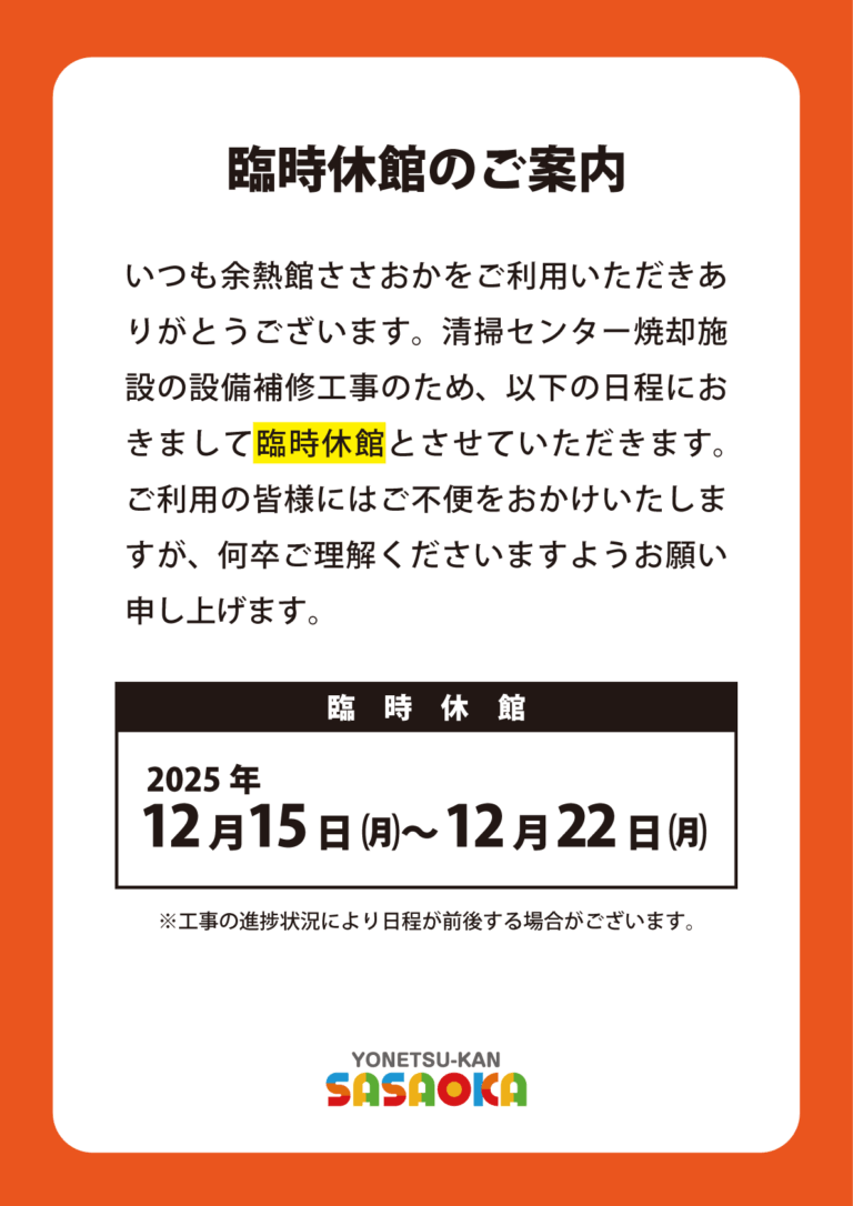 いつも余熱館ささおかをご利用いただき、誠にありがとうございます。
